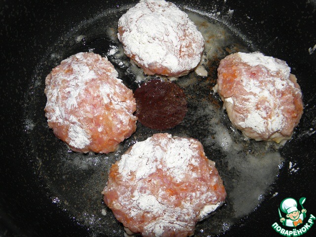 Руками, смоченными в воде, формируем из фарша небольшие котлеты и обваляем их в муке