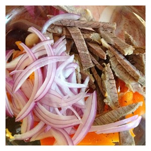 Говядину нарезать тонкой соломкой, красный лук полукольцами.
