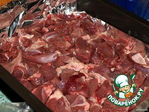 Мясо порезать на кусочки (у меня была индейка), уложить на лист, посолить