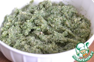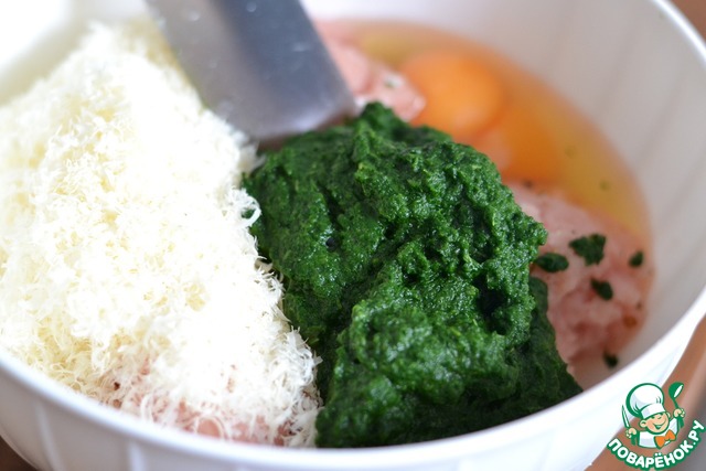 В миске смешать индюшачий фарш, яйца, сухари, сыр, соль и черный перец. Добавить пропущеный через пресс чеснок и шпинат.