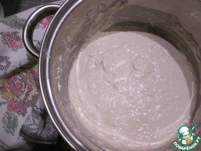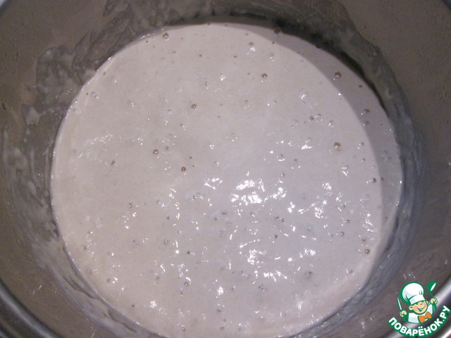 Сразу оговорюсь, что процесс приготовления оладьев на закваске длительный. Время, которое я указала в рецепте, относится к созреванию теста и приготовлению оладьев. Самый длительный процесс - созревание опары. Длительный, но не трудоемкий. Вам нужно только правильно рассчитать время. Итак, первым делом ставим опару, которая будет созревать 12 часов, следовательно, поставить ее лучше с вечера, часов в восемь. Для опары распускаем в воде комнатной температуры закваску. замешиваем муку, накрываем и оставляем до утра при температуре около 20 градусов.