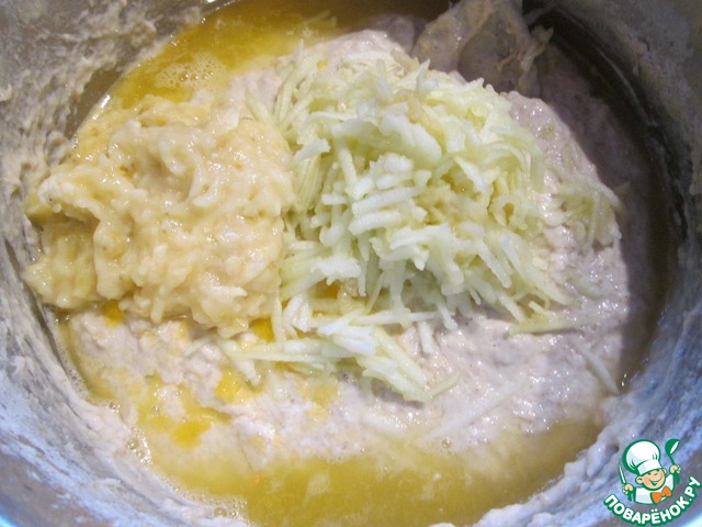 Теперь добавляем в опару соль, сахар, цельнозерновую муку, растительное масло, размешиваем. Выжимаем сок из апельсина, трем на терке яблоко, разминаем банан вилкой и все отправляем в тесто.