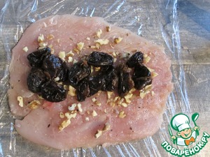 Чернослив залить кипятком минут на 10-15, мандарины почистить, разделить на дольки, орехи порубить или измельчить в блендере. Филе уложить на пищевую пленку, разрезать вдоль на две части, сложить половинки немного внахлест и хорошенько отбить, особенно в местах соединения. Мясо посолить и поперчить.