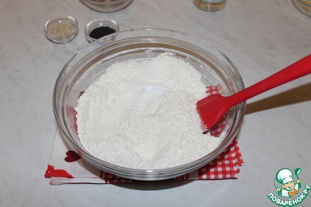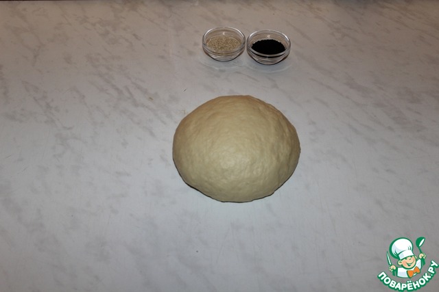 Смазываем желтком с 1 ст л молока и посыпаем кунжутом. Выпекаем при температуре 200 градусов 15-20 минут.