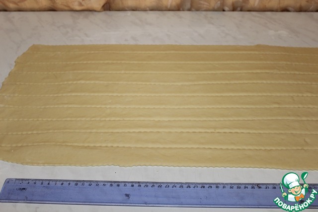 Раскатываем в пласт толщиной 5 мм. Нарезаем полосками шириной 3 см и длиной 60-70 см.