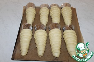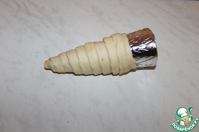 Конус смазываем растительным маслом. Полоску теста накручиваем по спирали.