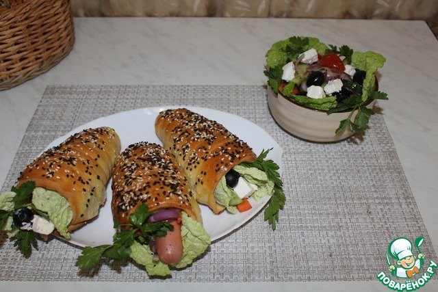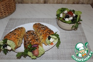 Начинить можно любой начинкой. У меня салат и сосиски.