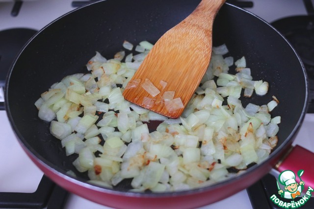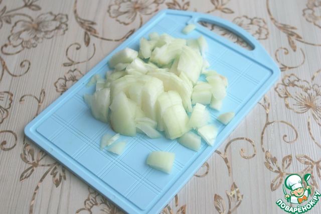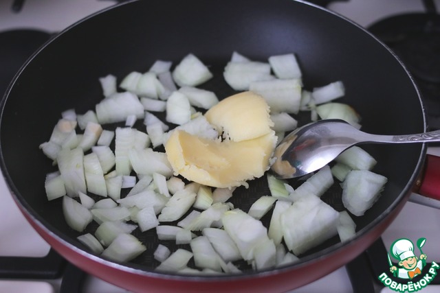 На сковороду добавить 3 столовые ложки топленого сливочного масла, добавить нарезанные кубики лука.