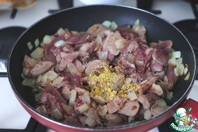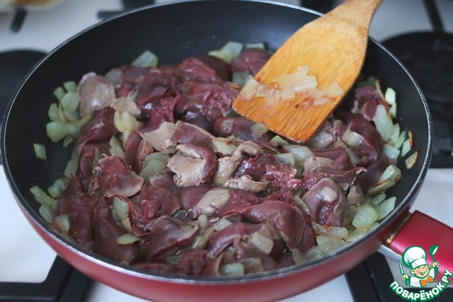 Далее добавить нарезанную печень кролика. Слегка обжарить. Тушить печень на медленном огне до готовности.