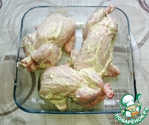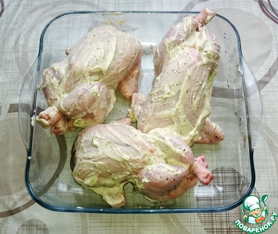Ножки связываем ниткой, хорошо обмазываем тушку майонезной смесью и выкладываем на противень на крылышки.