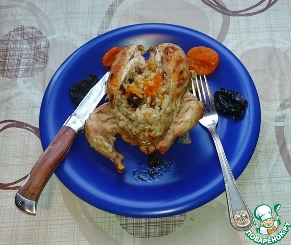 Начинаем мучать чыплят. Заворачиваем им крылышки за спину, хорошо солим и перчим как снаружи так и внутри. Набиваем брюшко смесью из риса и фруктов.