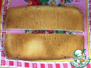 Готовый корж разрезать на две равные части. По краям тесто обрезать.