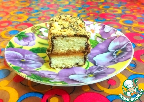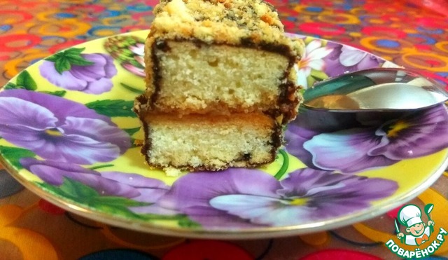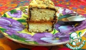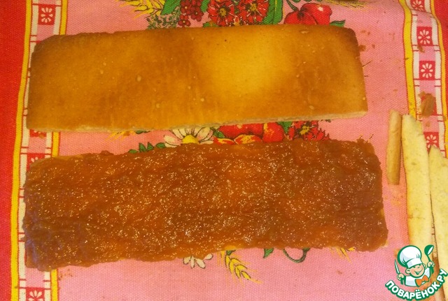 Одну часть коржа хорошо промазать джемом. У меня яблочный. Ещё очень вкусно получается с клубничным и вишневым. Накрыть вторым коржом. Оставить на пару часов для пропитки.