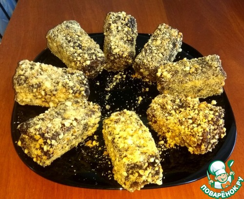 Затем пирожное выкладываем на посыпку и каждой стороной пирожное окунаем в крошку. Выкладываем на блюдо.