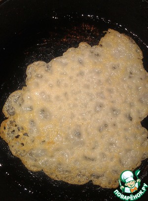 Испечь блинчики на раскалённой сковороде диаметром 20 см. При наливании на сковороду тесто должно кипеть (с шипением). Переворачивать, когда краешки зарумянятся. Складывая блинчики в стопочку, можно промазывать их сливочным маслом.