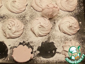 Зефиру даем застыть и стабилизироваться 3-4 часа. Можно оставить на ночь. После чего присыпаем крахмалом или смесью крахмала с сахарной пудрой. Затем аккуратно снимаем с противня и склеиваем попарно.