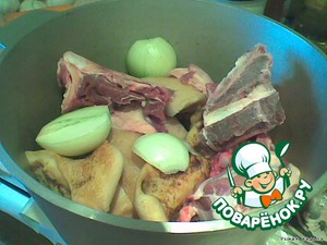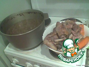 Заливаем водой, варим 5 часов на маленьком огне. Солим за 30 мин до конца варки