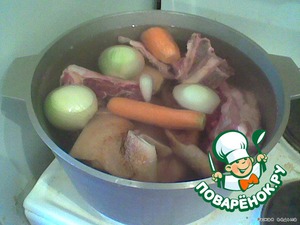Через 5 часов вытаскиваем из бульона мясо и овощи, даем немного остыть