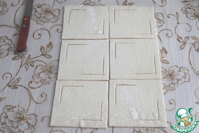 Лист теста раскатать, вырезать квадраты размером 10-12 см.