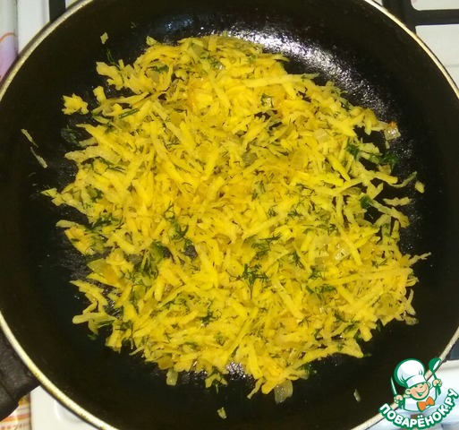 Лук поджарить на растительном масле до золотистого цвета. Добавить картофель, мелко нарезанную зелень, посолить и перемешать. Снять с огня. Картофель не жарить, доводить до готовности не нужно! -