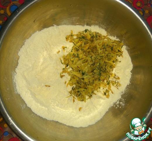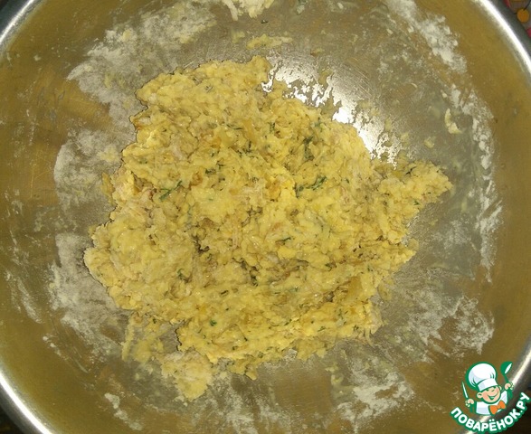 Перемешать вилкой, разбивая комочки, чтобы овощная смесь более-менее равномерно соединилась с мукой. -