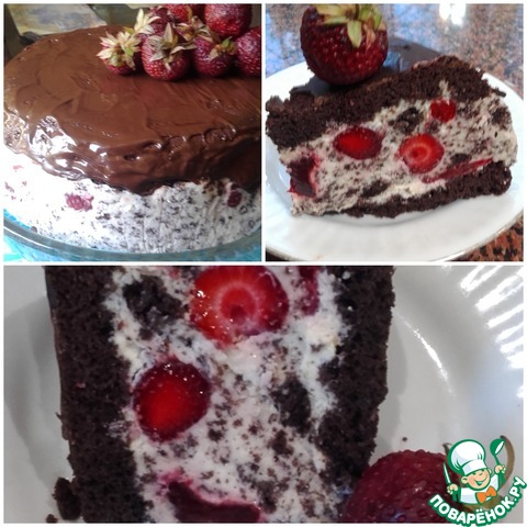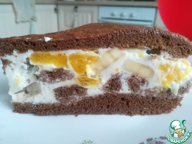 В форму, в которой выпекались коржи, положим одну половинку коржа (этот кружочек будет дном торта), затем фруктово-сметанную массу с кусочками коржа (серединка торта). Сверху все это покрываем вторым коржом. Ставим в холодильник на час, чтобы торт хорошенько пропитался.