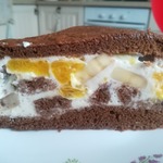 Далее. Крем. В ингредиентах написано 500 гр сметаны, а в технологии приготовления - ПОЛЛИТРА. Девочки, простите, но что касательно сметаны, полллитра и 500 гр. - это небо и земля. Разница будет раза в полтора. А учитывая, что о размерах фруктах (или их весе)тоже ничего не говорилось (а веди апельсины - очень сочный плод, и в зависимости от размера, целых два апельсина могут весьма разное количество жидкости в крем добавлять), вот лично у меня желатина на всё это явно не хватило (он был хорошего качества, испытанный - тут проблем быть не могло). И торт потёк. Т.е. все-таки, наверное, нужно было не поллитра сметаны класть а 500 гр.