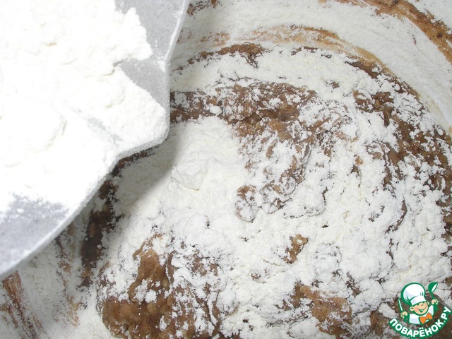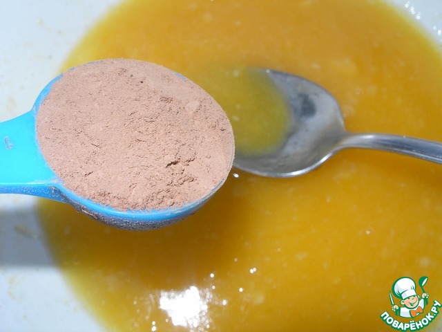 Растопить 100г сливочного масла, дать немного остыть и ввести 100г мёда, 1 яйцо, 1 ст. л. какао-порошка и всё тщательно перемешать.