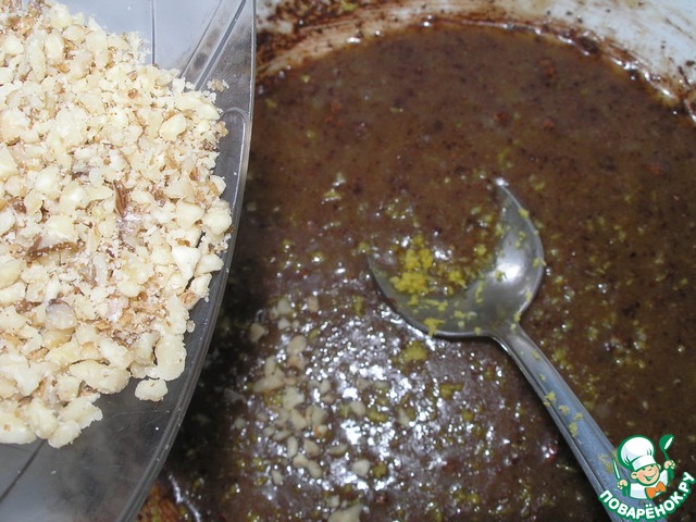 Добавляем к смеси натёртую цедру от половинки лимона и измельчённые в блендере грецкие орехи. Опять тщательно перемешиваю.