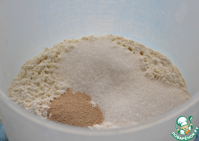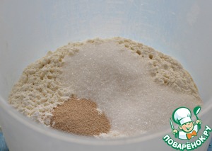 Муку просеять. Смешать с солью, сахаром и дрожжами.