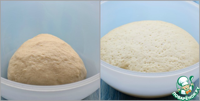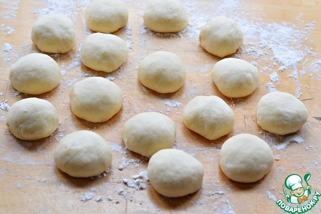 Подошедшее тесто выложить на рабочую поверхность, присыпанную мукой, обмять, разделить на 16 частей (примерно по 30 г)