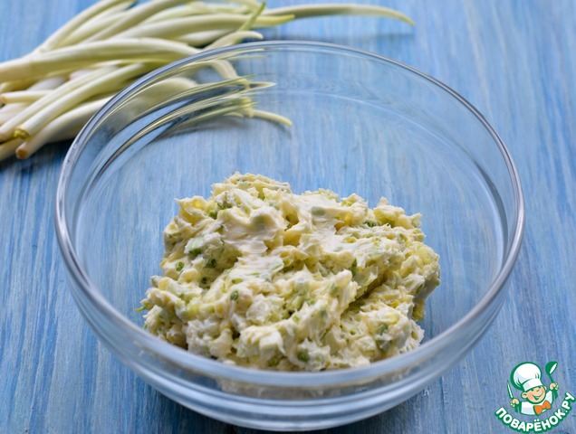 Черемшу измельчить и смешать с размягченным сливочным маслом. (оставшиеся 70 граммов)