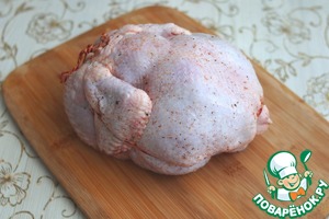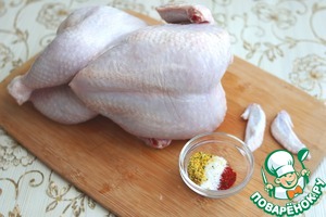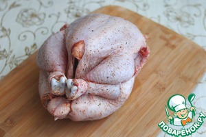 Курицу промыть, слегка обсушить бумажным полотенцем, удалить верхние фаланги на крыльях. Натереть внутри и снаружи смесью соли, лимонного перца и паприки.