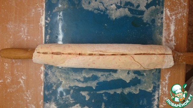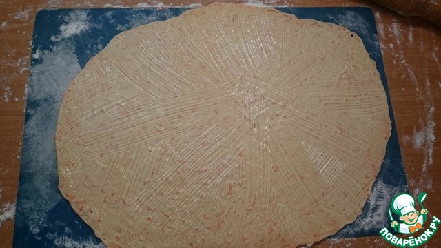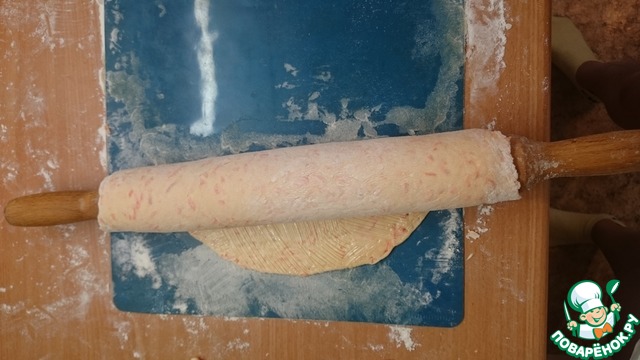Каждую порцию теста раскатываем в пласт толщиной примерно 3мм. Для этого лучше как следует посыпать мукой рабочую поверхность.