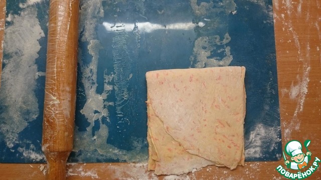 Складываем тесто пополам так, чтобы масляная часть оказалась внутри.
