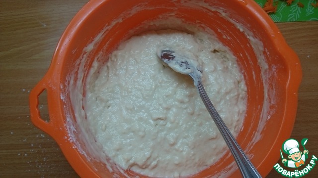 Добавляем в воду 1/2 муки, перемешиваем. Затем всю морковь, перемешиваем.