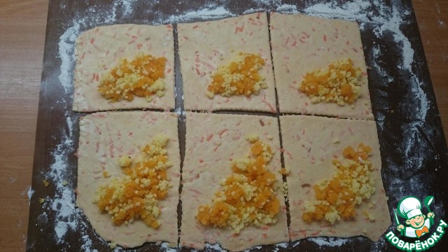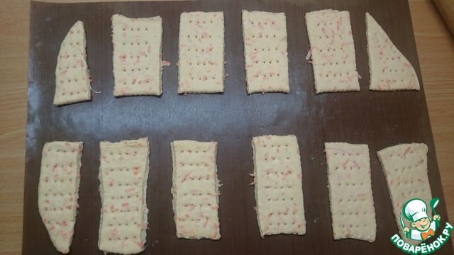 Вынимаем из морозилки необходимое количество теста (я взяла 2 порции). Раскатываем каждую порцию отдельно в пласт толщиной 3-5мм. Разрезаем на квадраты/ прямоугольники/ треугольники и прокалываем вилкой.