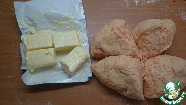 Масло равномерно распределяем по тесту (на каждый пласт по 1 кусочку): сначала ложкой, потом силиконовой кисточкой.