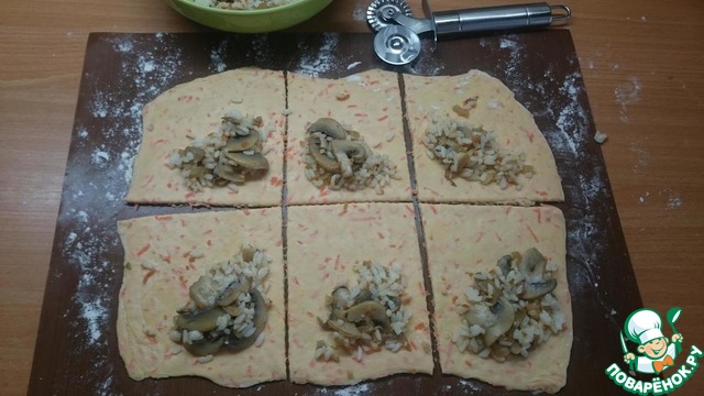 Из оставшихся двух порций теста сделала пирожки. С начинкой из грибов, риса и лука.