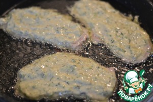 Обмакнуть куриное мясо в тесто и сразу же выкладываем его на сковороду, в раскаленное подсолнечное масло