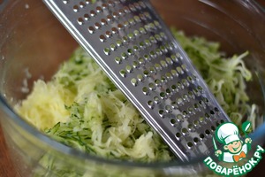 Я выкладываю тертый картофель и цуккини в дуршлаг, чтобы стекла лишняя жидкость. Еще и ложкой слегка придавить.