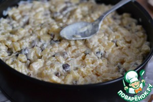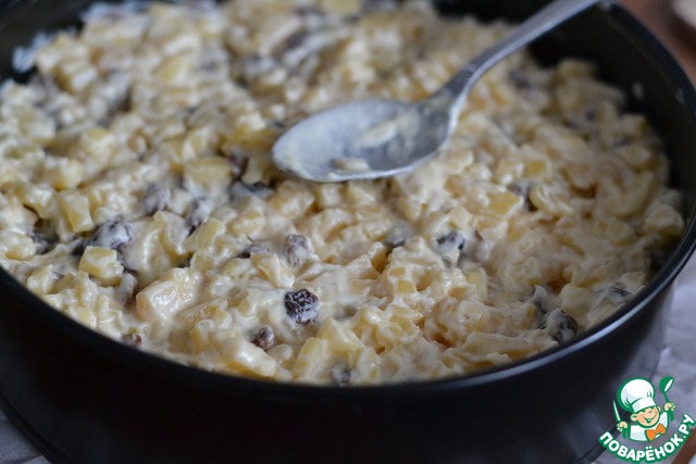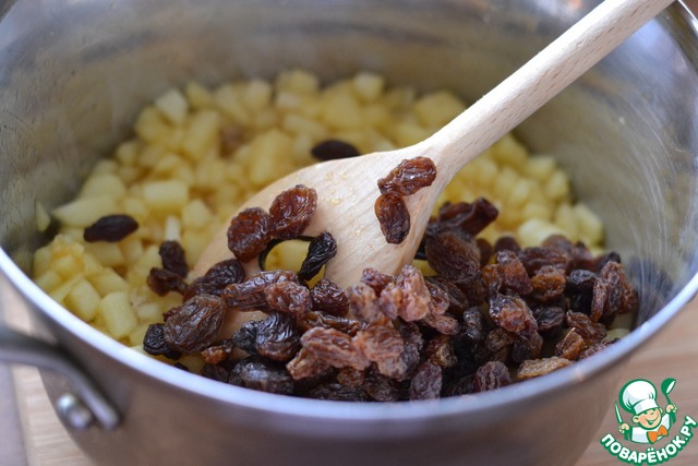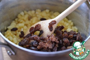 Убрать яблоки с огня и добавить изюм. Перемешать.