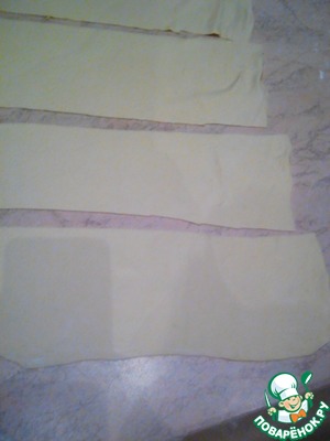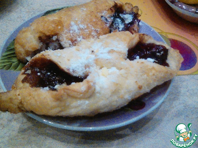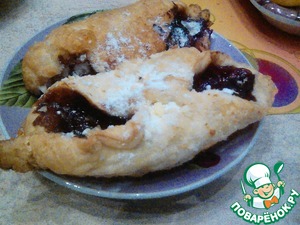 Тесто слоеное ( я купила готовое). Раскатать пластами. Порезать на пластины. Сделать квадраты. Смазать растительным маслом. Внутрь положить джем. Джем может быть любым ( у меня был черничный). Чтобы джем не растекался положить 0,5 ч ложки крахмала. Защипнуть.