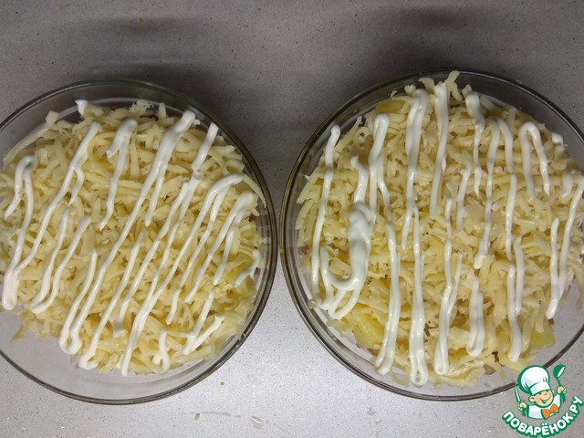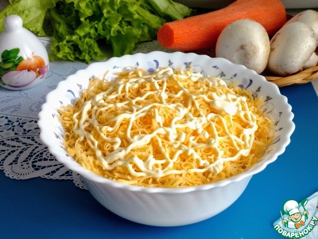 Сверху на крупной тёрке натереть сыр и сделать аккуратную сетку из майонеза.