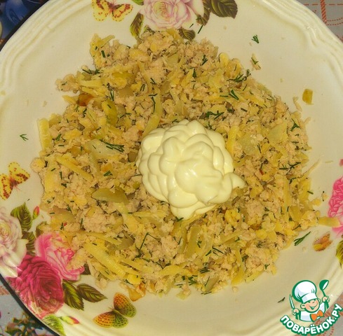 Соединить все ингредиенты для начинки, посолить, добавить майонез, хорошо перемешать.