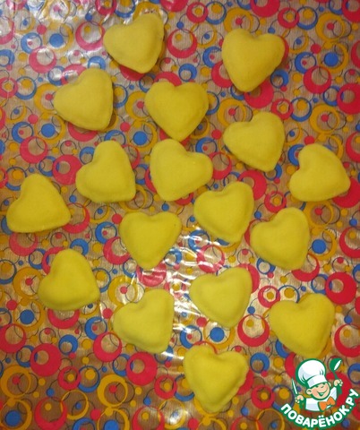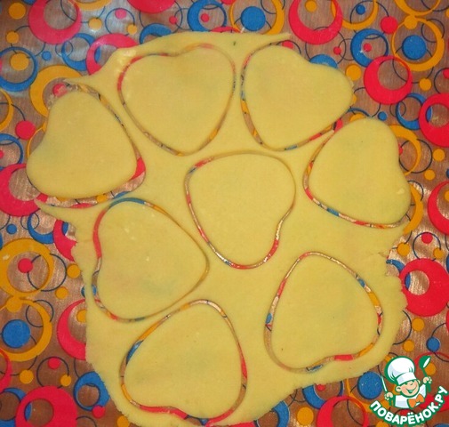 Разделить тесто на несколько частей, чтоб удобнее было раскатывать. Я на 3 части делила. Каждую часть тонко раскатать, примерно 2 мм толщиной. Формочкой в виде сердца вырезать сердечки, если нет такой формочки, то можно круглые вырезать стаканом.