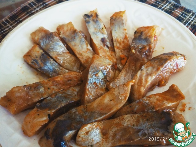 • Переходим ко второму посолу "Пикантному". Нарезаем рыбу, также полосками.