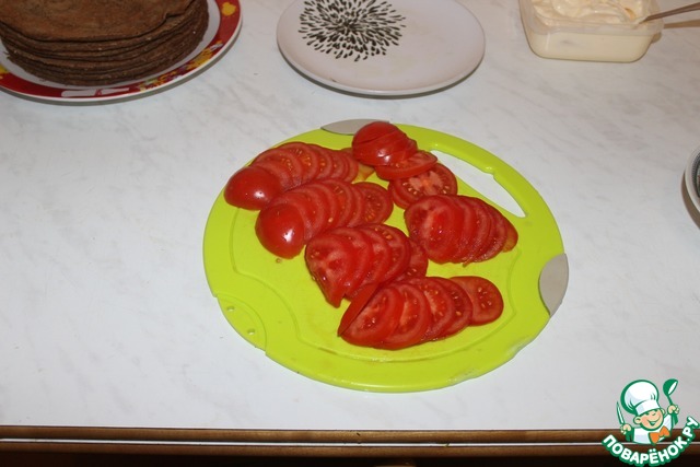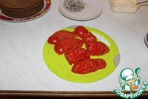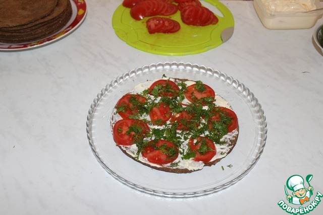 Выкладываем кружочки помидор. Посыпаем зеленью.