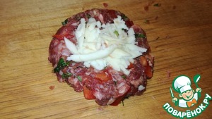 Сыр трем на крупной тёрке. Берём фарш, приблизительно 1 ст. л., формируем плоский круг. По центру положить тёртый сыр.