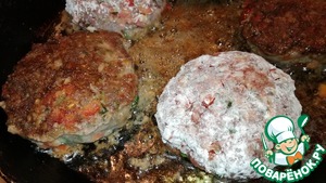 Котлеты обвалять в муке. В разогретую сковороду налить подсолнечное масло и обжарить каждую котлету в течении 2-3 минут до румяной корочки. Переложить в форму для запекания, налить 3 ст. л. воды и отправить в заранее разогретую духовку до 180° на 20-25 минут. Ориентируетесь на свою духовку.